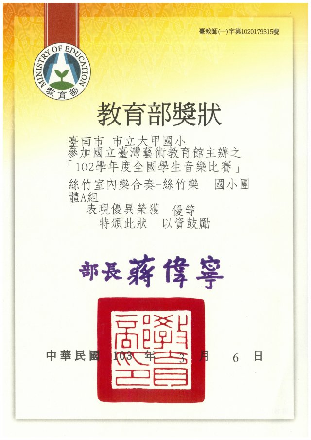 代表臺南市參加102學年度全國學生音樂比賽南區決賽,獲得絲竹室內樂合奏國小團體B組優等。