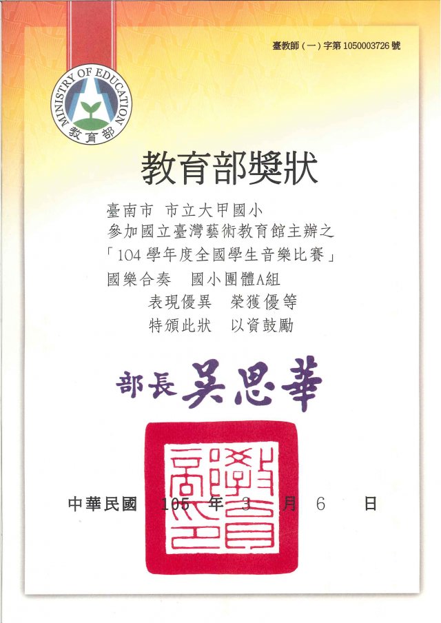 代表臺南市參加104學年度全國學生音樂比賽南區決賽,獲得國樂合奏國小團體A組優等。