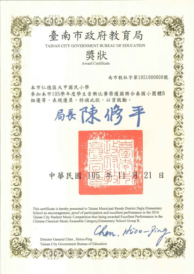 本校獲得國樂合奏國小團體B組優等,並取得代表臺南市參加全國賽資格。