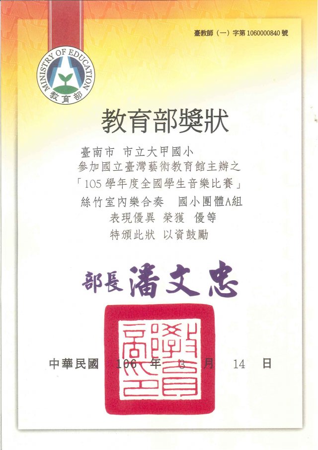 恭喜本校獲得絲竹室內樂合奏國小團體A組優等。