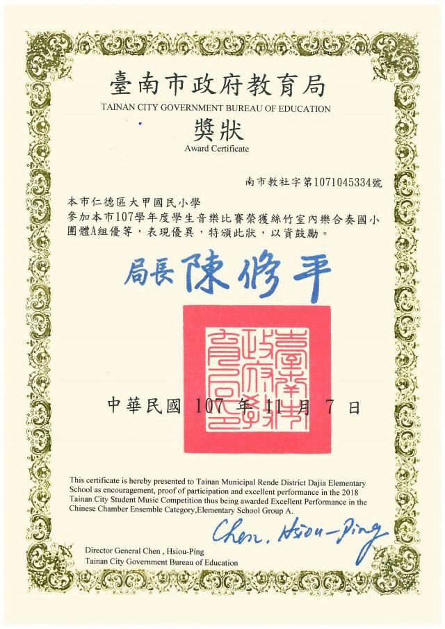 絲竹室內樂合奏優等,代表臺南市參加全國賽